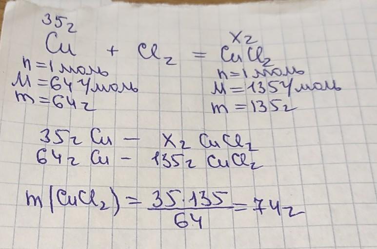 Сколько граммов хлорида меди CuCl2 образуется при взаимодействии 35г меди с хлором?