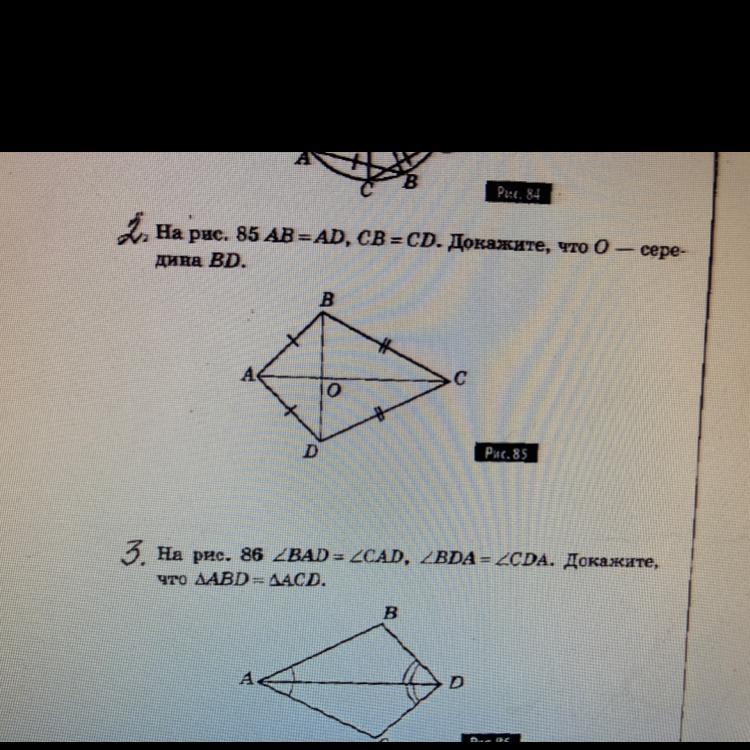 На рис. 85 АВ=AD, cB = CD. Докажите, что 0 — сере-
