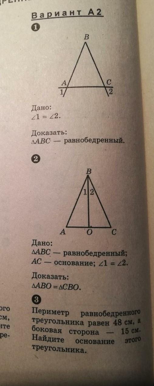 2. ВО общая, Углы 1, 2 равны по условию, АВ=ВС из за того, что АВС равнобедренный.