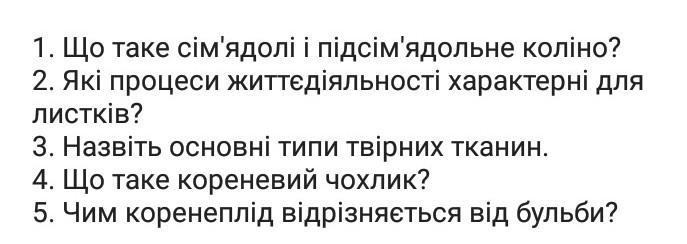Ответ:1)Сім'ядолі - овальні частинки насінини молодого проростка, які розміщені одна навпроти одної. ... Підсім'ядольне коліно - циліндрична частина проростка під сім'ядолями. У дорослої квіткової рослини сім'ядолі та сім'ядольне коліно не зберігаються.2) У листках відбуваються процеси повітряне живлення, випаровування, газообмін, дихання, ріст та розвиток.3)Основними типами твірних тканин е верхівкові і бічні. Верхівкові твірні тканини розташовані на верхівках коренів і пагонів, завдяки ним відбувається ріст рослини в довжину та утворення нових частин кореня і пагона. Бічні твірні тканини зумовлюють ріст у товщину вже існуючих коренів і стебел — так зване потовщення.4)Корневой чехлик — защитное образование растущего кончика корня. Служит защитой преимущественно от механических повреждений. Это небольшой конусовидный колпачок, длиной обычно около 0,2 мм, реже — до нескольких миллиметров, прикрывающий нежные клетки апикальной меристемы кончика корня и часть его зоны роста. 5)Коренеплід — це потовщений головний корінь, в якому відкладаються поживні речовини. ... Кореневі бульби ж утворюються в результаті потовщення бічних або додаткових коренів (пшінка, батат, жоржина).