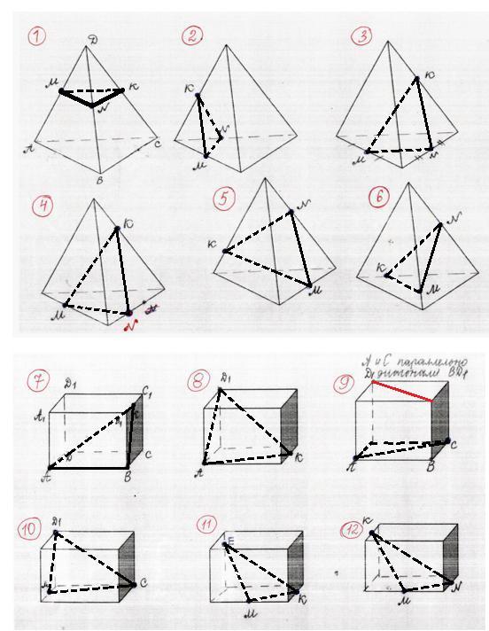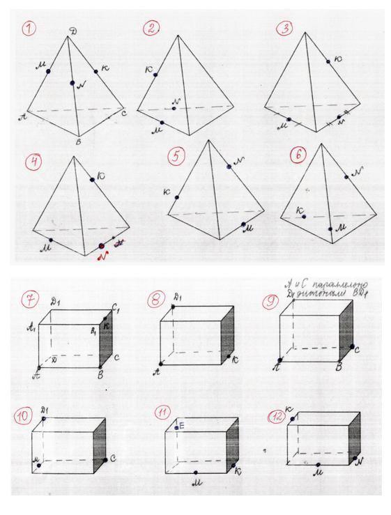Для рисунков 1-6: построить сечения тетраэдра DABC плоскостью, проходящей через данные точки M, N, K. Обратите внимание: КАЖДЫЙ ТЕТРАЭДР обозначьте как на рисунке 1.