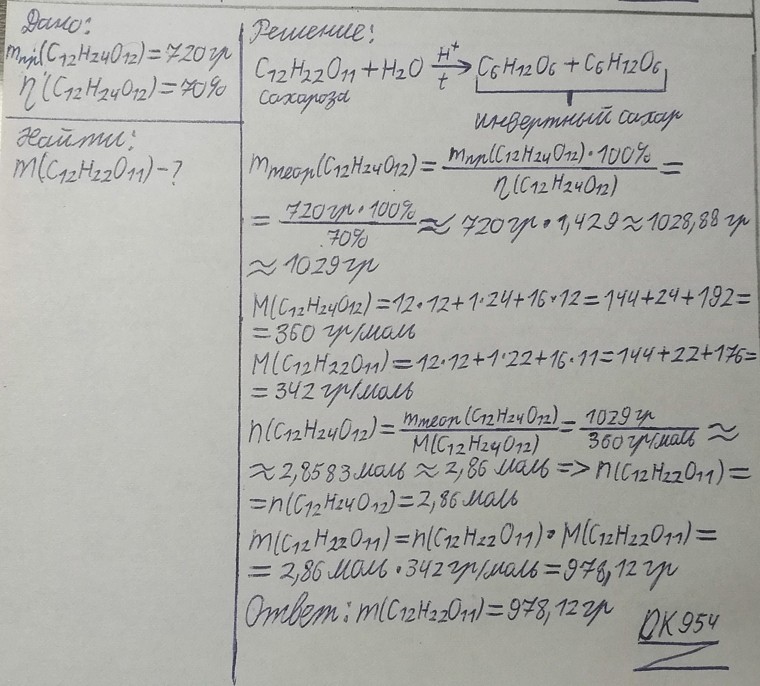 Сколько нужно взять сахарозы для получения из нее гидролизом 720 г инвертного сахара при выходе 70%