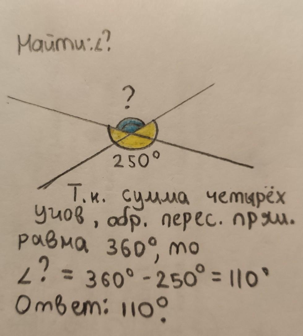 найдите угол между прямыми если известно, что сумма трех углов из четырех образованная этими прямыми равен = 250 °