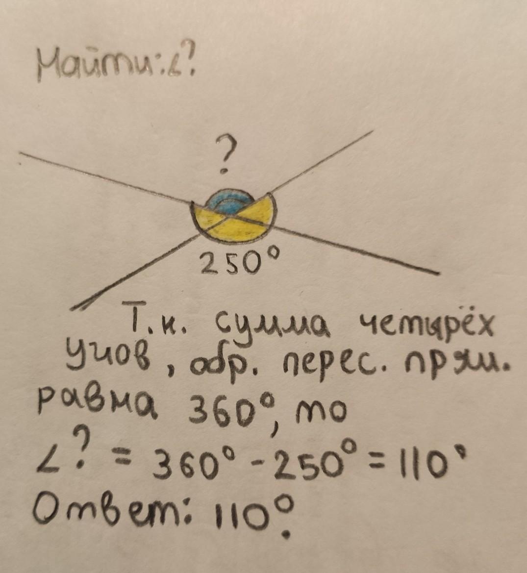 найдите угол между прямыми если известно, что сумма трех углов из четырех образованная этими прямыми равен = 250 °