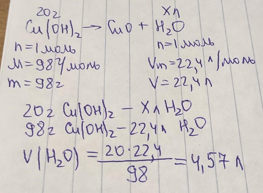 Определите объём воды H2O которое выделится при разложении 20г меди (||) - Cu(OH)2 . В ходе реакции разложения образуется оксид меди (||) - CuO