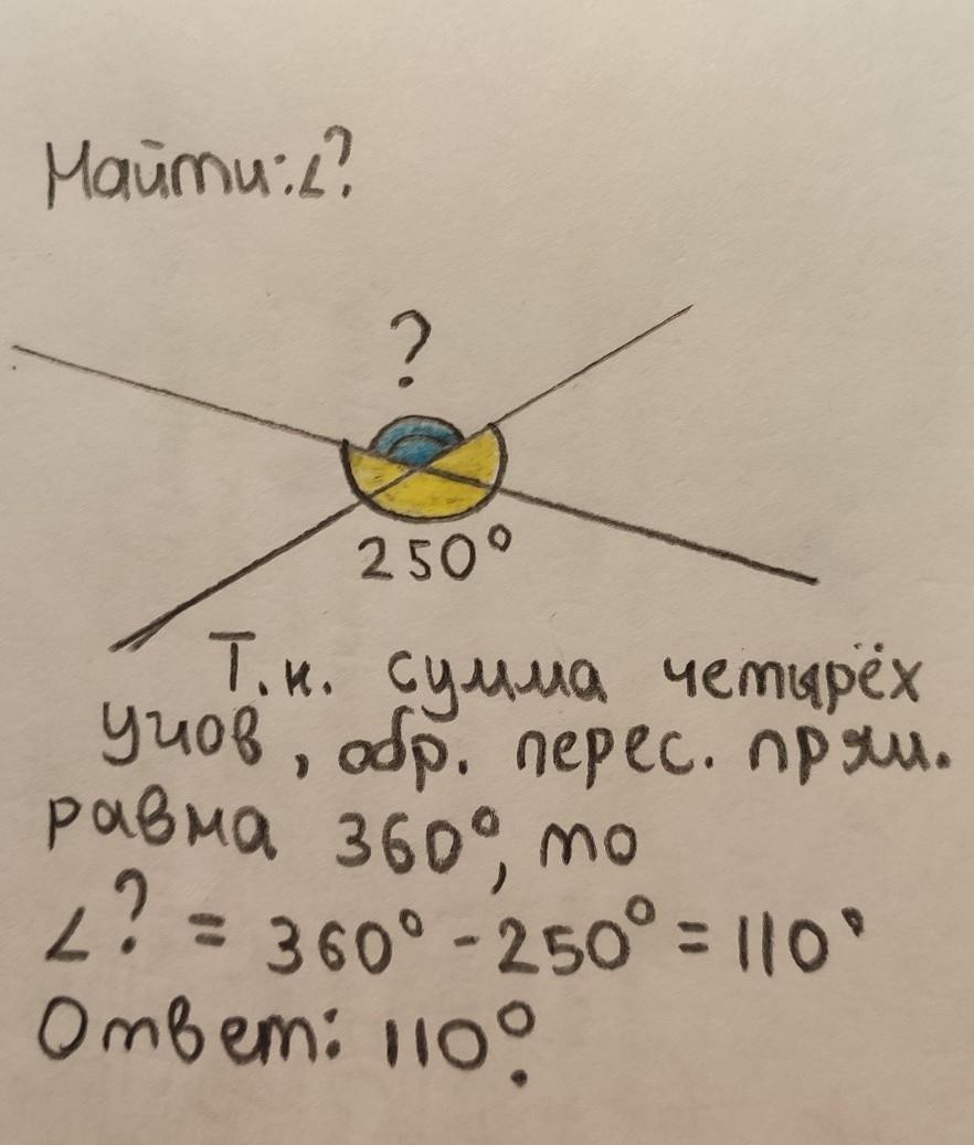 найдите угол между прямыми если известно, что сумма трех углов из четырех образованная этими прямыми равен = 250 °