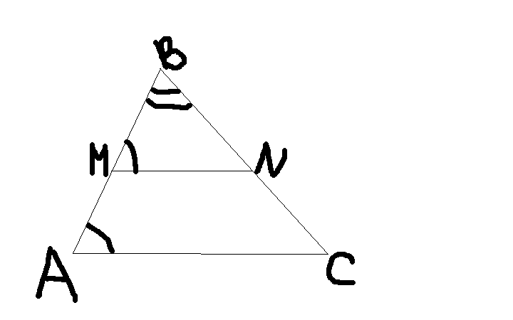 Рассмотрим треугольники АВС и BMN. Они подобны по первому признаку подобия: угол А равен углу М (соответственные углы при параллельных прямых), угол В - общий.