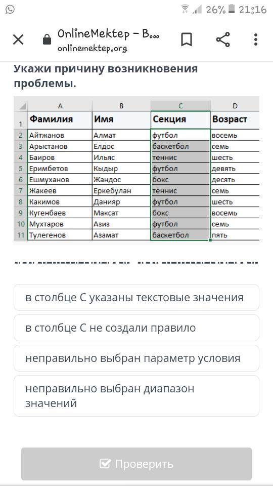 Алмат хочет применить в таблице для наименования секции функцию условного форматирования. Для этого он выбрал "Цветовые шкалы". В результате значения столбца С не закрасились. Укажи причину возникновения проблемы.