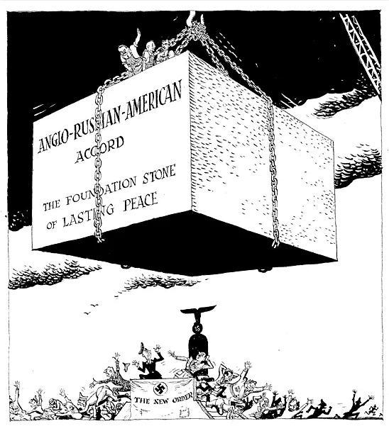 P.S Карикатура 1 надпись: "Договор Англии, СССР и США. Краеугольный камень прочного мира"