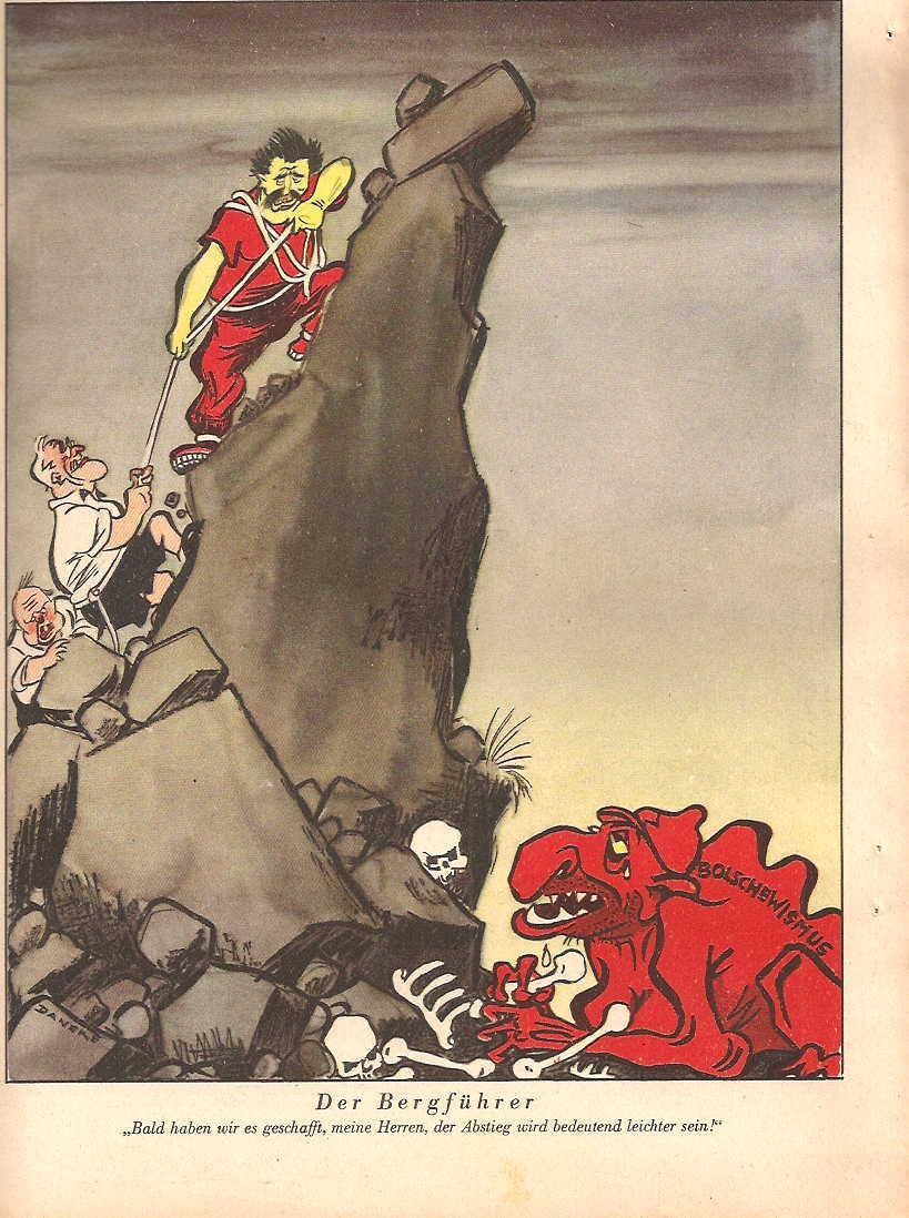 На 1 карикатуре показано, что антигитлеровская коалиция это камень который раздавит фашизм. На 2 карикатуре фашизм показывает, что Сталин тащит людей которые погибнут для большевизма. Эти карикатуры разные, так как сделаны в противоборствующих странах в время войны. Именно поэтому они разные, это пропаганда для своих граждан, чтобы те видели ради чего идёт война и для граждан вражеских стран, чтобы их мотивация уменьшилась.