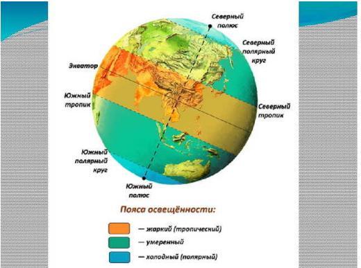 3. Солнечный свет дает помимо света и тепловую энергию, следовательно территория, получающая максимум освещенности, будет получать и максимум тепла. Эта зона выделена рыжим цветом.