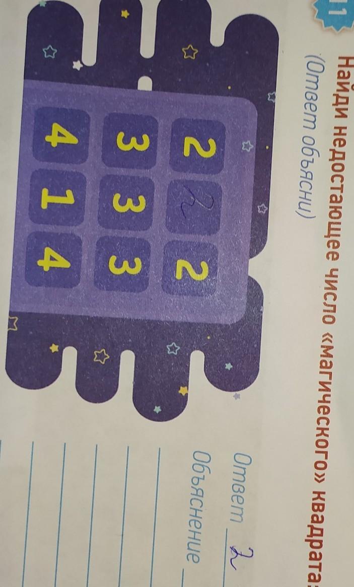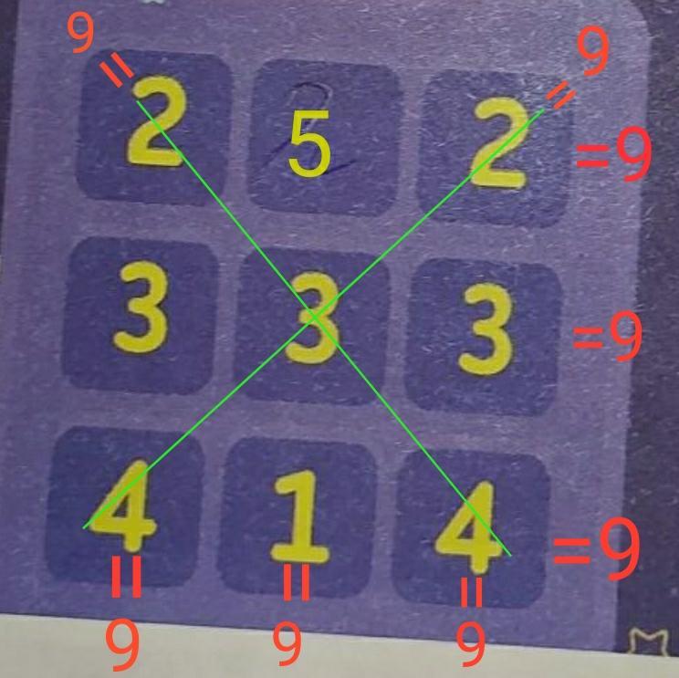 Объяснение: сумма чисел в каждом ряду по горизонтали и вертикали оавнп 9. То есть во втором ряду 3+3+3=9, в первом столбце 2+3+4=9 и т.д.