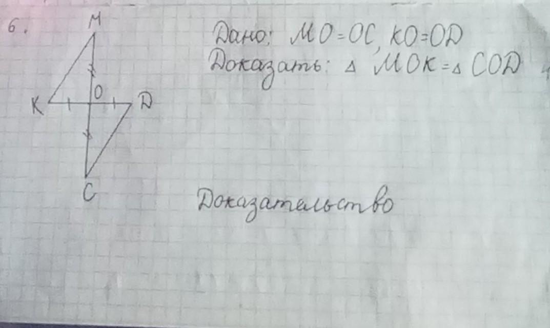 Так как MO = OC, значит, углы, находящиеся между ними, тоже равны как вертикальные при пересекающихся прямых.