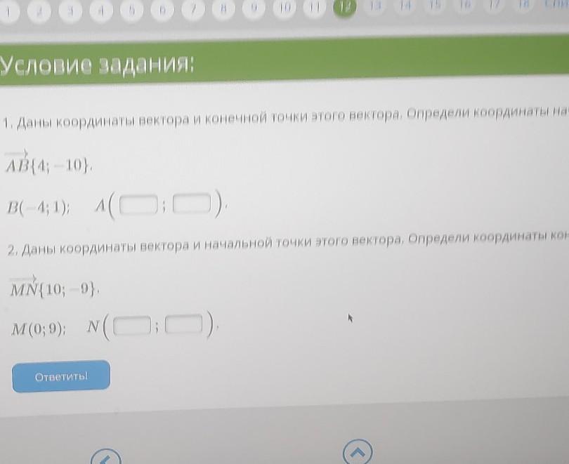 обозначим координаты точки N(x;y), тогда вектор MN будет иметь координаты MN{x-0;y-9}, по условию MN{10;-9}