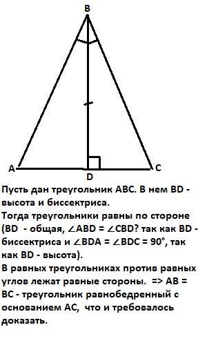 Тогда треугольники равны по стороне (BD - общая, ∠ABD = ∠CBD? так как BD - биссектриса и ∠BDA = ∠BDC = 90°, так как BD - высота).