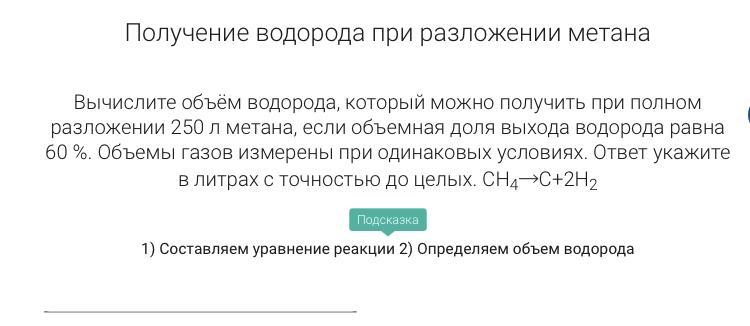 Вычислите объём водорода, который можно получить при полном разложении 250 л метана, если объемная доля выхода водорода равна 60 %. Объемы газов измерены при одинаковых условиях. Ответ укажите в литрах с точностью до целых. CH4→C+2H2