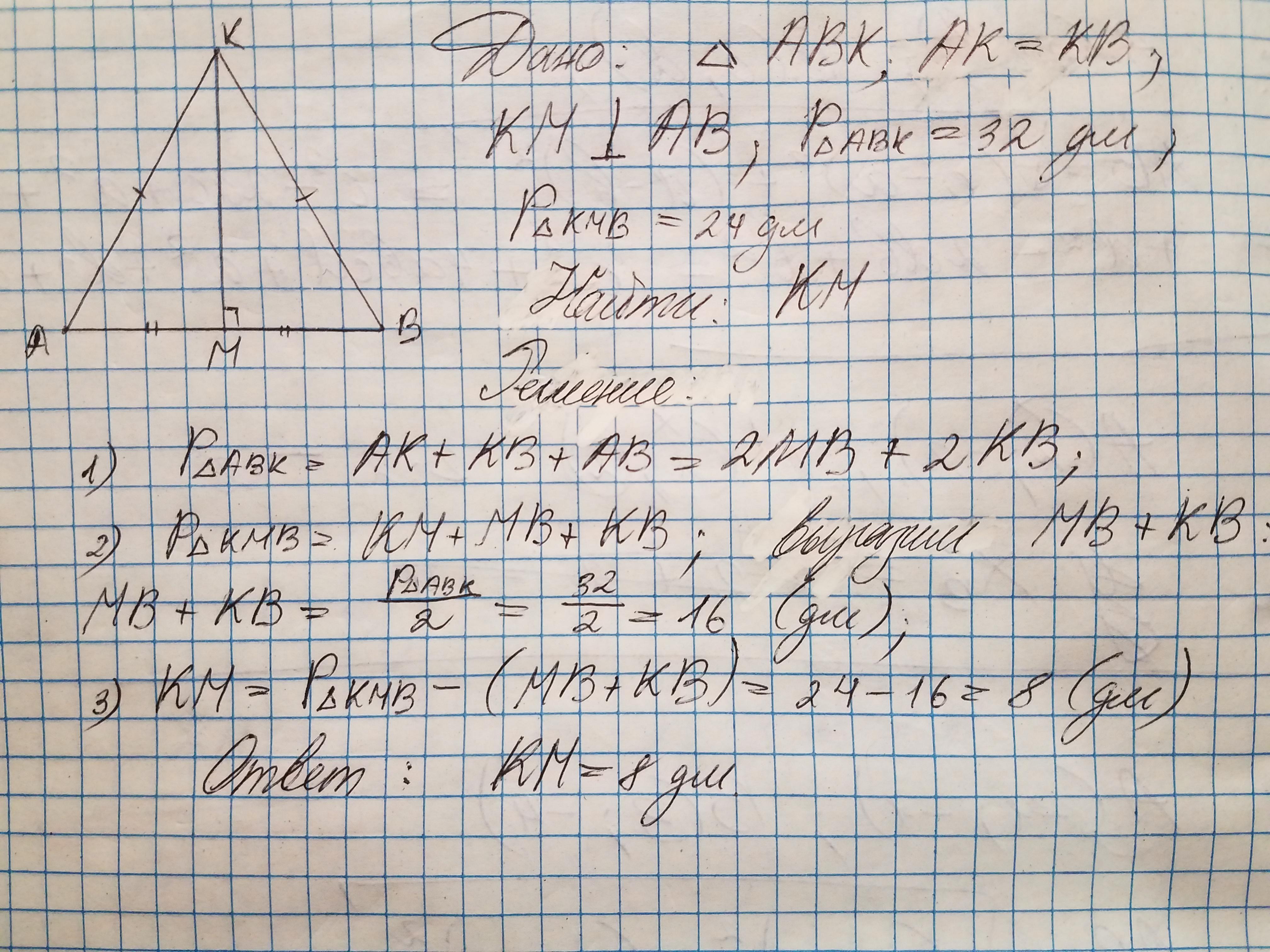 Срочно!КМ - медіана рівнобедреного трикутника АВК, основа якого АВ. Знайдіть довжину цієї медіани, якщо периметр трикутника АВК дорівнює 32 дм, а периметр трикутника КМВ - 24 дм