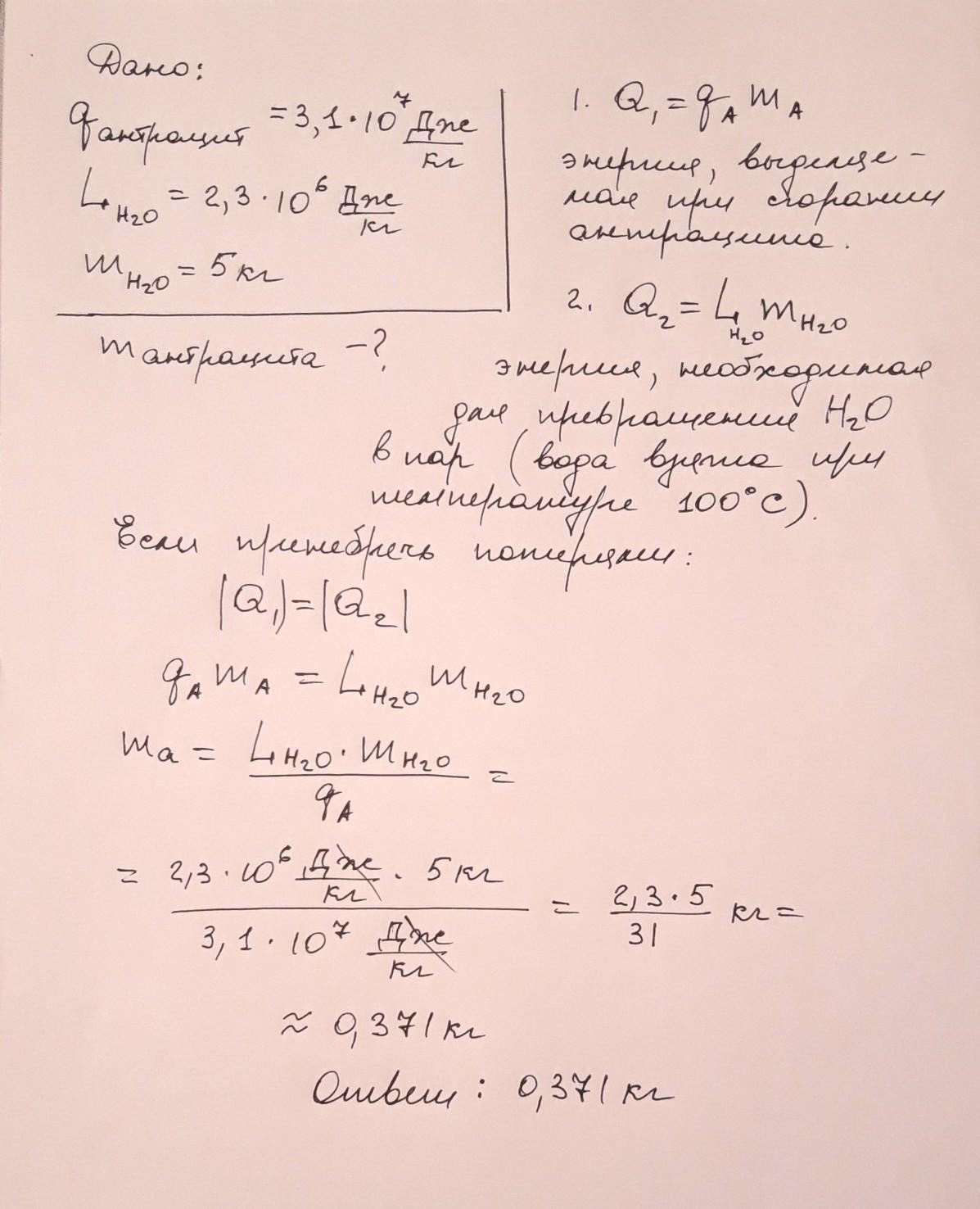 Какое количество антрацита надо сжечь, чтобы превратить в пар 5 кг воды, взятой при температуре 100 градусов С?