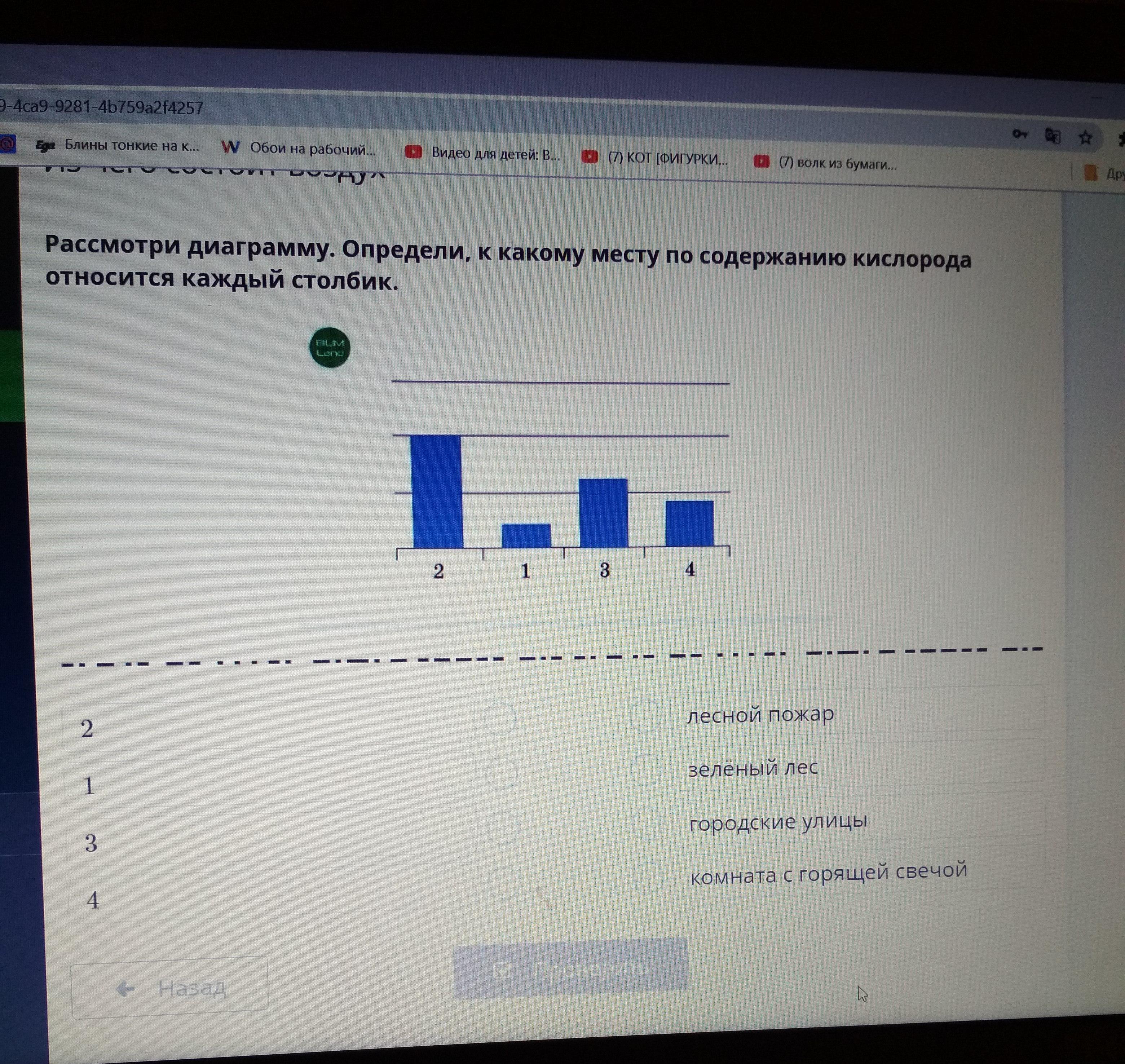 Помогите пожалуйста срочно! Рассмотри диаграмму. Определи к какому месту по содержанию кислорода относится каждый столбик.