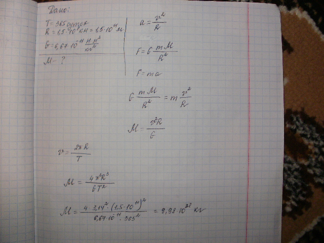 Земля совершает полный оборот по своей орбите вокруг Солнца за время T≈365 суток. Считая радиус орбиты Земли равным R≈1,5·10 в 8 степени км, оцените массу Солнца.