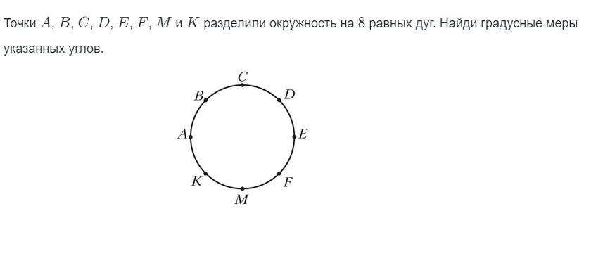 Точки A, B, C, D, E, F, М и К разделили окружность на 8 равных дуг. Найди градусные меры указанных углов.