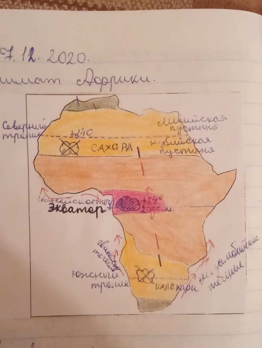 В Африки 2 субтропических пояса, 2 тропических и экваториальный. Также в Африке находится самая большая пустыня в мире - Сахара. В центре Африке (экваториальном поясе) выпадает самое большое количество осадков на всём континенте. Африку огибают Гвинейское и Мозамбикское течение.