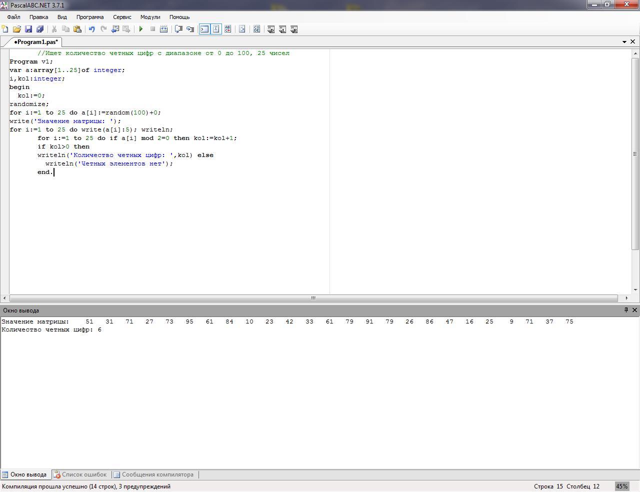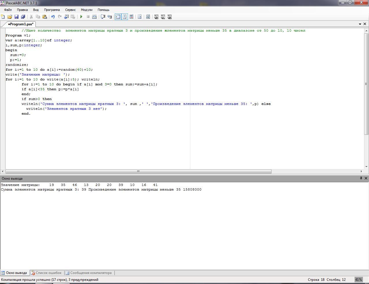 writeln('Сумма элементов матрицы кратных 3: ', sum ,' ','Произведение элементов матрицы меньше 35: ',p) else