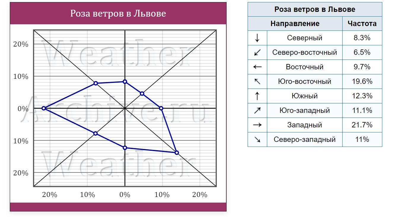 Как видно из розы ветров Львовской области, которая дана ниже в приложении, преобладающее направление ветра за год западное (21,7 %) и юго-восточное (19,6 %).