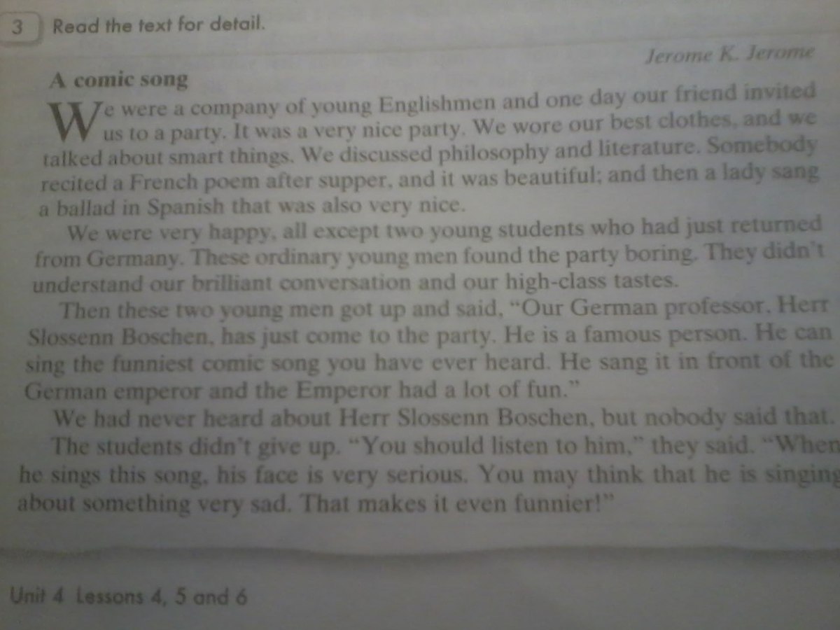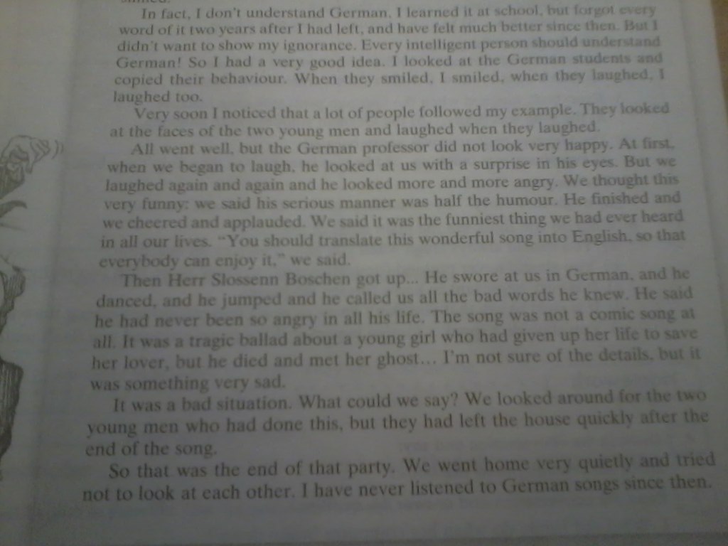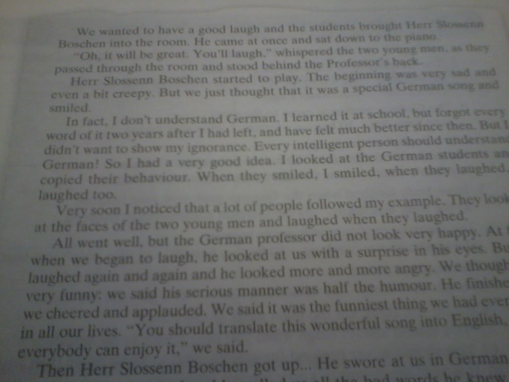 У нас была компания молодых англичан. Однажды, наш друг пригласил нас на вечеринку. Это была замечательная вечеринка. Мы надели наши лучшие одежды и разговаривали об умных вещах. Мы обсуждали философию и литературу. Кто-то прочитал французское стихотворение, это было прекрасно. Затем одна девушка пела балладу на испанском, что также было очень красиво. Мы были очень счастливы, все, кроме двух студентов, которые только что вернулись из Германии. Эти заурядные парни считали вечеринку скучной.Они не понимали нашу многогранную беседу и наши высокоинтеллектуальные вкусы. Потом молодые люди встали и сказали: Наш немецкий профессор Herr Slossen Boschen( не знаю как произносится) только что пришел на вечеринку.ОН известный человек. Он может петь самые забавные песни, которые вы когда-либо слышали. Он пел их перед немецким императором, и император очень веселился. Мы никогда не слышали о Herr Slossen Boschen, но не сказали об этом. Студенты не сдавались. "Вам следует послушать его"-говорили они. " КОгда он поет эту песню, его лицо очень серьезное. Вы можете подумать, что он поет о чем-то грустном. И это делает песню еще смешнее."