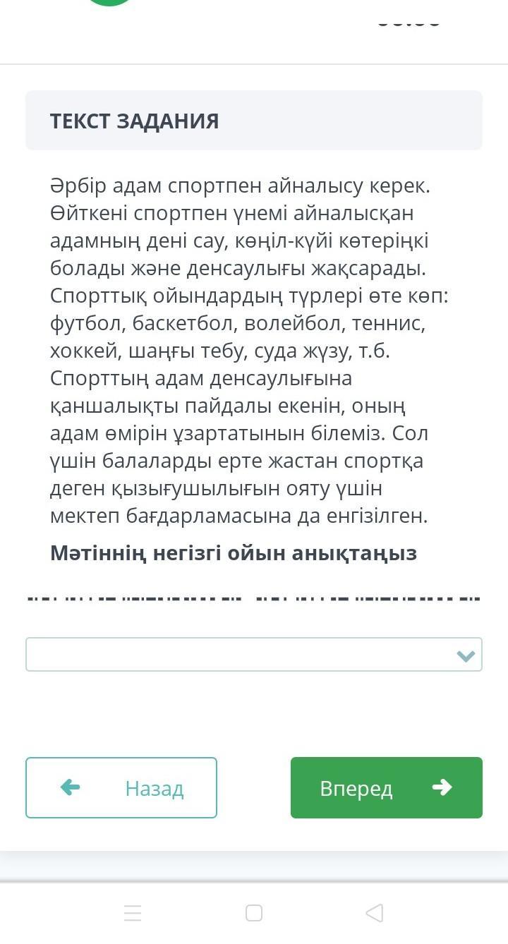Мәтінің негізгі ойын анықтаңыз. Выбери из трех ответов 1: 1. Спорт-денсаулық кепілі. 2. Спорт- денсаулыққ зиян. 3. Спорт- менің сүйікті ісім. Помогите пожаалууйййста умоляю пожалуйста срочно