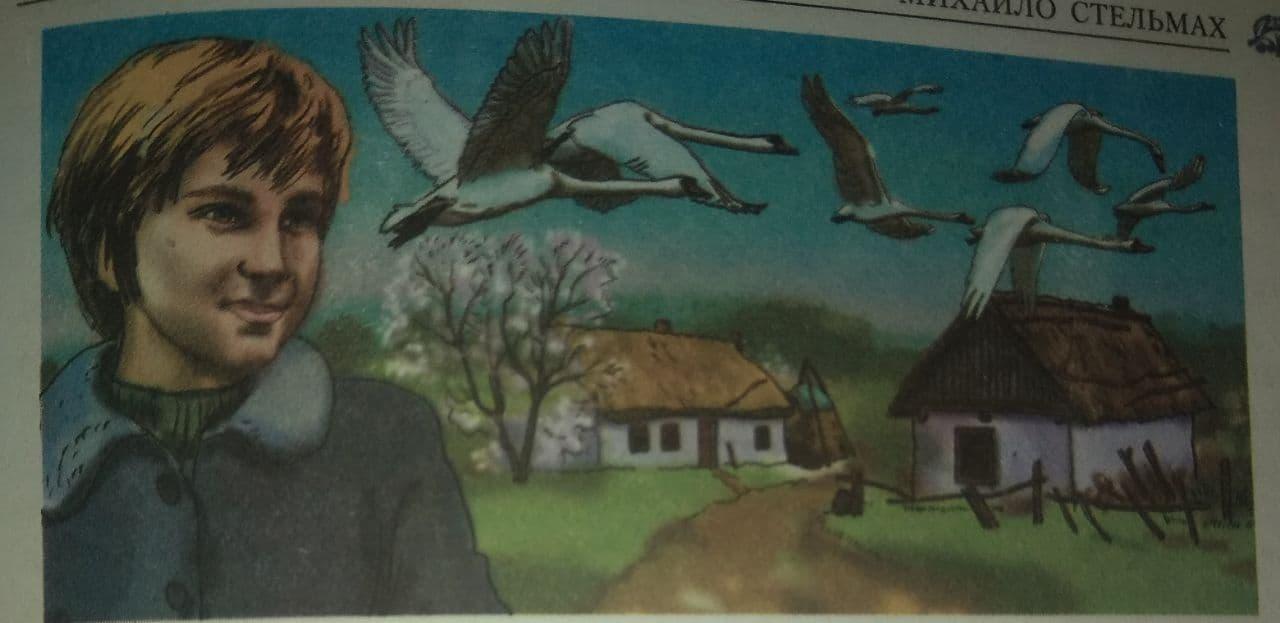На мою думку, найбільш вдала ілюстрація до першої частини, яка точно передає про те, що розповідається. На передньому плані бачимо радісного хлопчика. На задньому плані – заквітчані дерева у білому весняному цвіті. Над хатами летять лебеді.