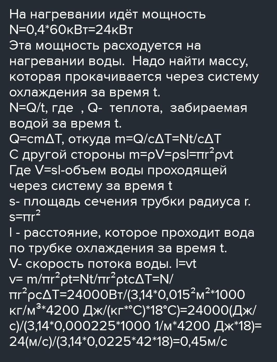 Энергетическая установка мощностью 80 кВт охлаждается проточной водой, протекающей по спиральной трубке, диаметр которой 18 мм. При установившемся режиме вода в трубке нагревается на 15°С. Определи скорость прокачки воды в охладительной системе, если известно, что на нагревание идёт 49 % энергии установки. Удельная теплоёмкость воды равна 4200 Дж/(кг·°С), плотность воды — 1000 кг/м³. При расчётах прими π=3,14.