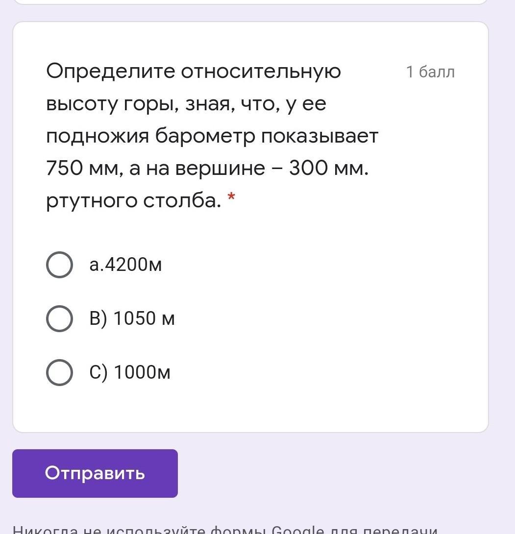 Определите относительную высоту горы, зная, что, у ее подножия барометр показывает 750 мм, а на вершине – 300 мм. ртутного столба.