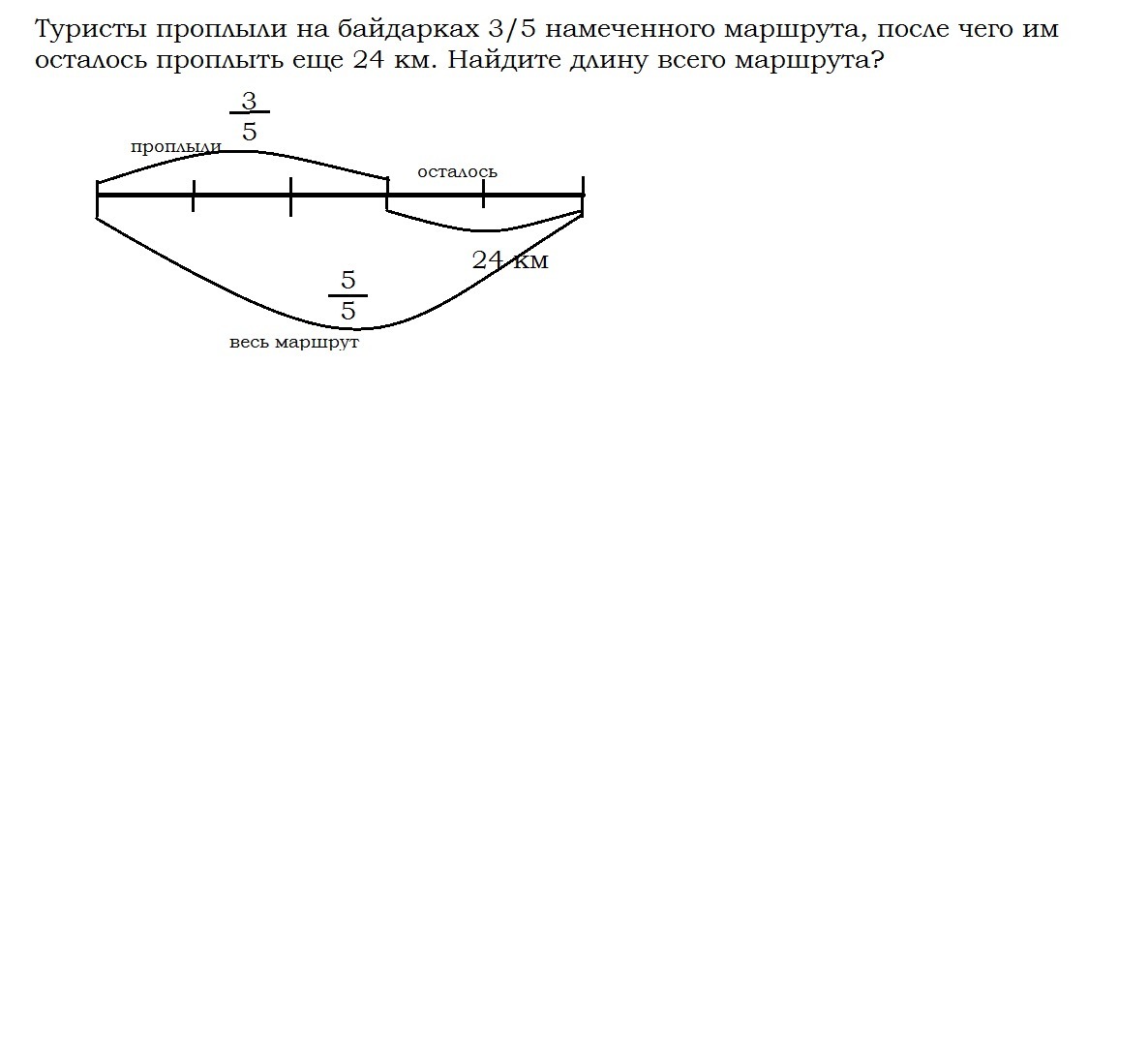 Туристы проплыли на байдарках 3/5 намеченного маршрута, после чего им осталось проплыть еще 24 км. Найдите длину всего маршрута?