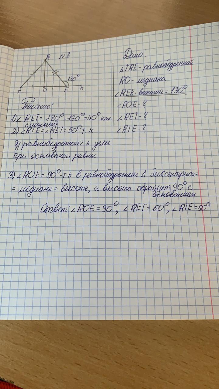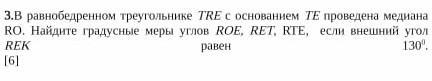 .В равнобедренном треугольнике TRE с основанием TE проведена медиана RO. Найдите градусные меры углов ROE, RET, RTE, если внешний угол REK равен 130⁰ с чертижомм пжжжжэ