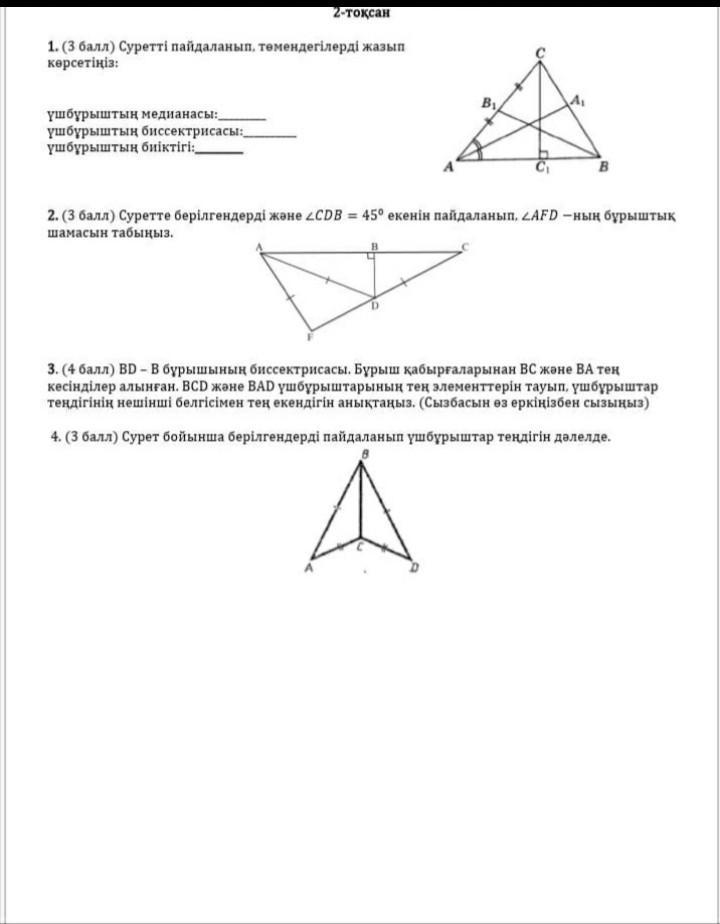 2. Суретте берілгендерді және ∠CDB=45^0 екенін пайдаланып, ∠AFD-ның бұрыштық шамасын табыңыз.