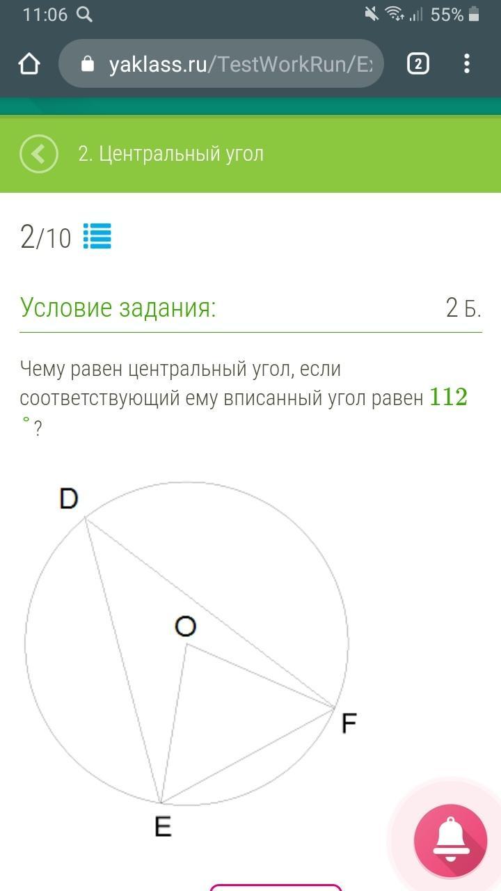 Чему равен центральный угол, если соответствующий ему вписанный угол равен 112?