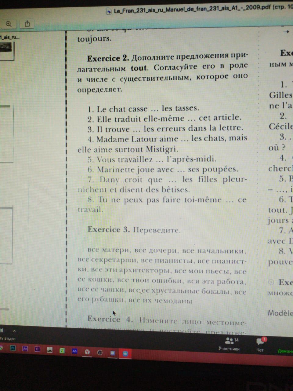 Дополните предложениями прилагательными tout. Согласуйте его в роде и числе с существительными, которое оно определяет. (Exercice 2)