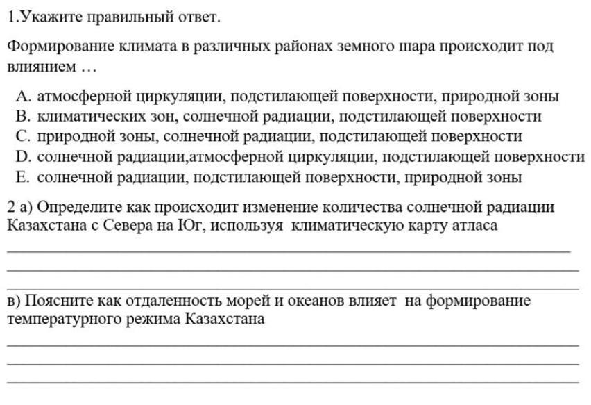 1.Основными факторами, влияющими на формирование климата Земли, является солнечная радиация, циркуляция атмосферы и характер подстилающей поверхности. При их совместном влиянии формируется климат в различных районах земного шара.