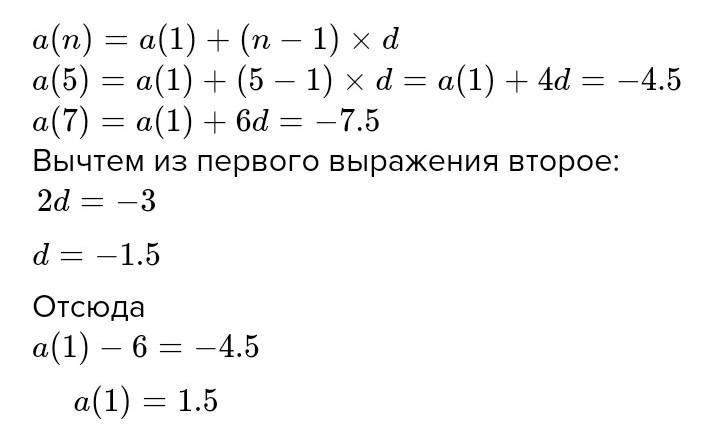 В Арифметической прогрессии пятый член- 4,5, а седьмой член-7,5. Найдите сумму 12 членов арифметической прогрессии