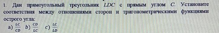 1. Дан прямоугольный треугольник LDC с прямым углом C. Установите соответствия между отношениями сторон и тригонометрическими функциями острого угла: