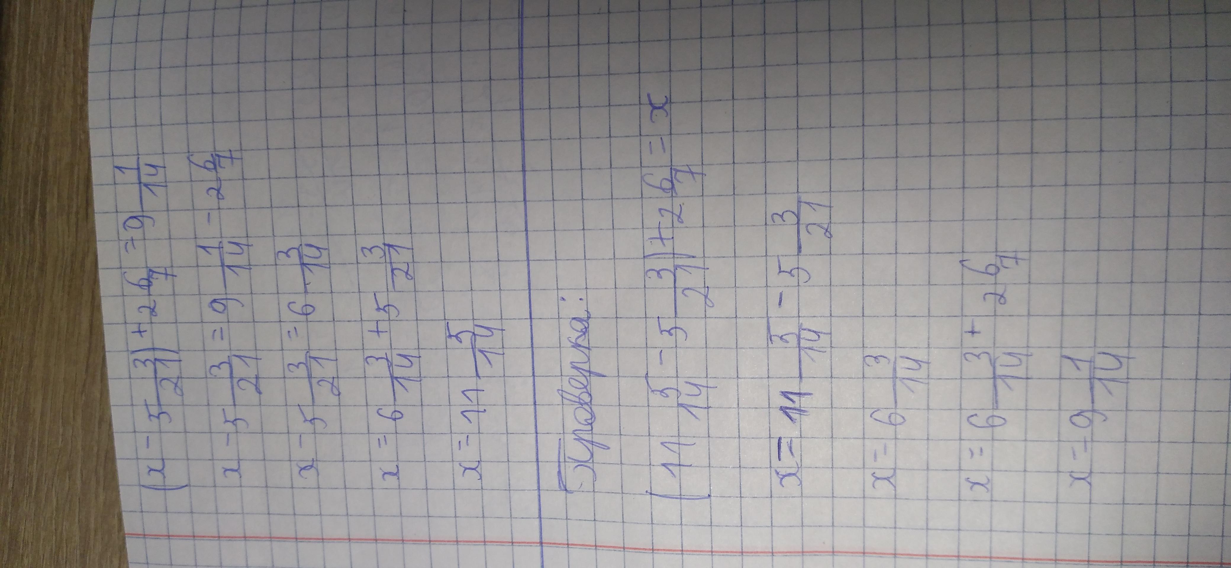 Из ответа данного уравнения(9 целых 1/14) вычитаем 2 целых 6/7. Получаем 6 целых 3/14. Это число складываем с числом в скобках.(5 целых 3/21). Получаем ответ 11 целых 5/14.