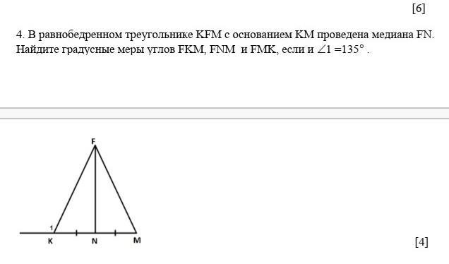 4. В равнобедренном треугольнике KFM с основанием KM проведена медиана FN. Найдите градусные меры углов FKM, FNM и FMK, если и 1 =135 .