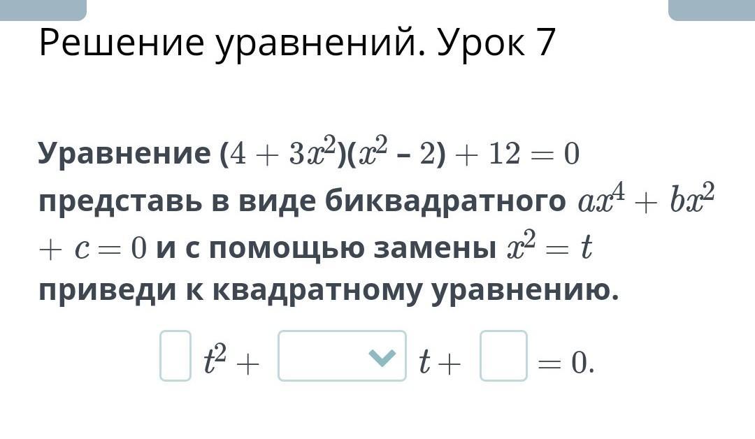 Уравнение (4 + 3x2)(x2 – 2) + 12 = 0 представь в виде биквадратного ax4 + bx2 + c = 0 и с помощью замены x2 = t приведи к квадратному уравнению.