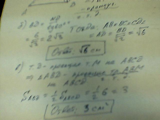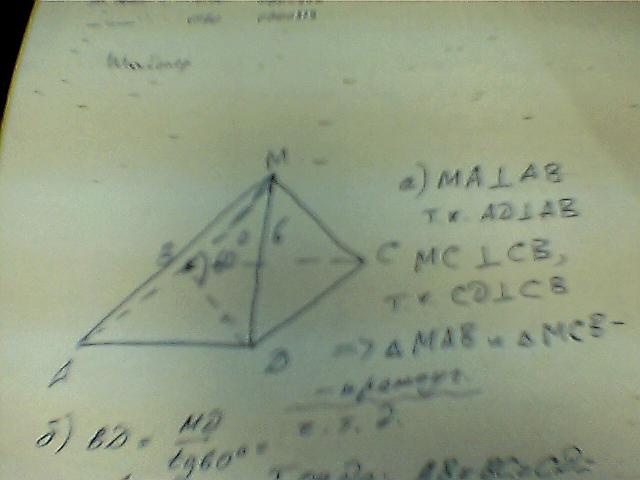 ПРОШУ, СРОЧНО НУЖНА ВАША ПОМОЩЬ! Дано: ABCD-квадрат MD перпендик. ABCD=6 cм MB-наклонная и образует с плоскостью квадрата угол 60 градусов Док: а) треуг.MAB и треуг.MCB-прямоугольные б) найти стор. ABCD в) треуг. ABC явл. проекцией треуг.MAB на плоскости квадрата. найти площадь треуг. ABD