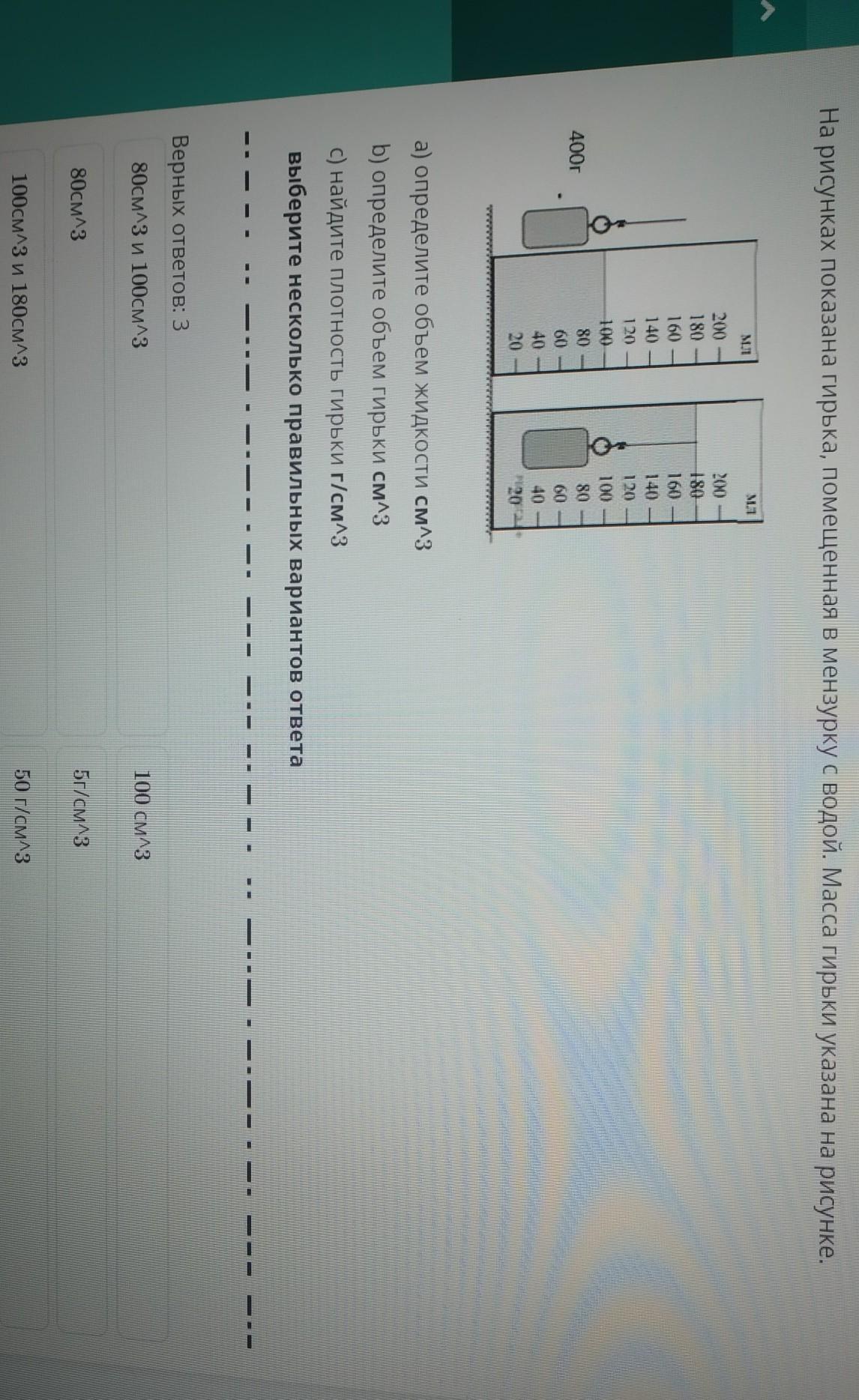 б) V (гирьки) = 180 - 100 = 80 (cм^3)