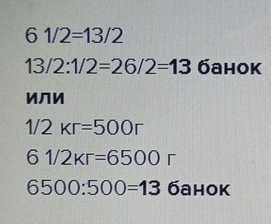 Банка вмещает 1/2 килограммов мёда Сколько надо взять таких банок Чтобы разлить в них 6 1/2 кг мёда?