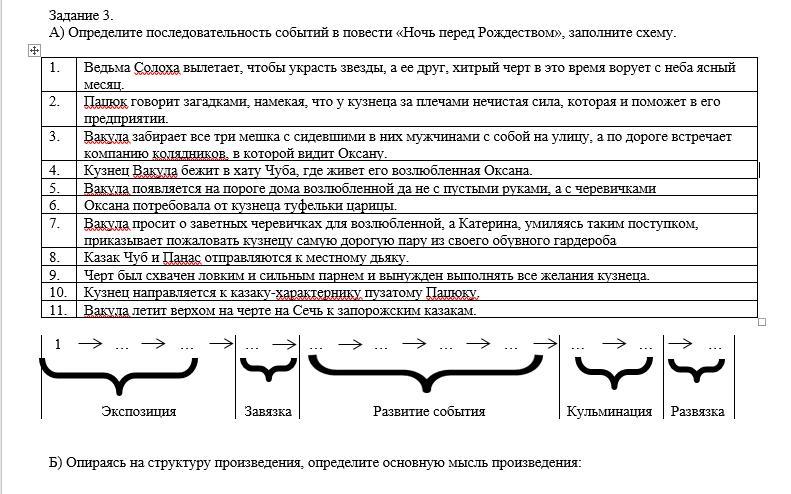 А) Определите последовательность событий в повести «Ночь перед Рождеством», заполните схему.