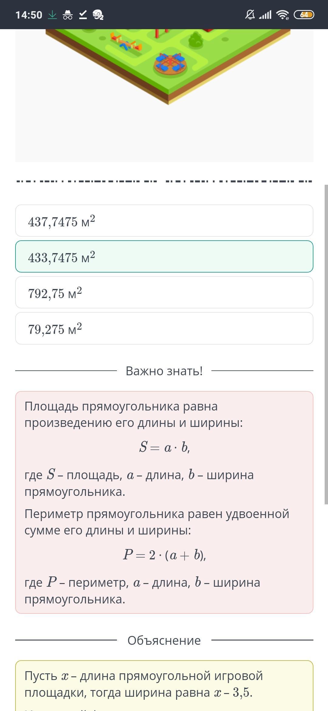 Ширина прямоугольной игровой площадки на 3,5 м меньше его длины. Периметр площадки равен 83,6 м. Найди площадь игровой площадки.