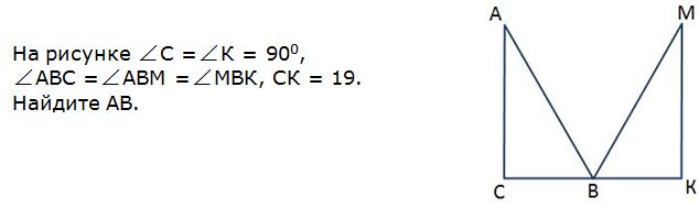 Угол АВС=АВМ=МВК величина развернутого угла 180 градусов значит при равенстве этих углов, каждый равен 180/3=60 градусов и величины углов в треугольнике 90, 60 и 30 градусов. Если провести перпендикуляр к точке А или М величина угла будет 90 - 30=60 градусов или получается равносторонний треугольник АВМ. СК=АМ или АВ=АМ=19.